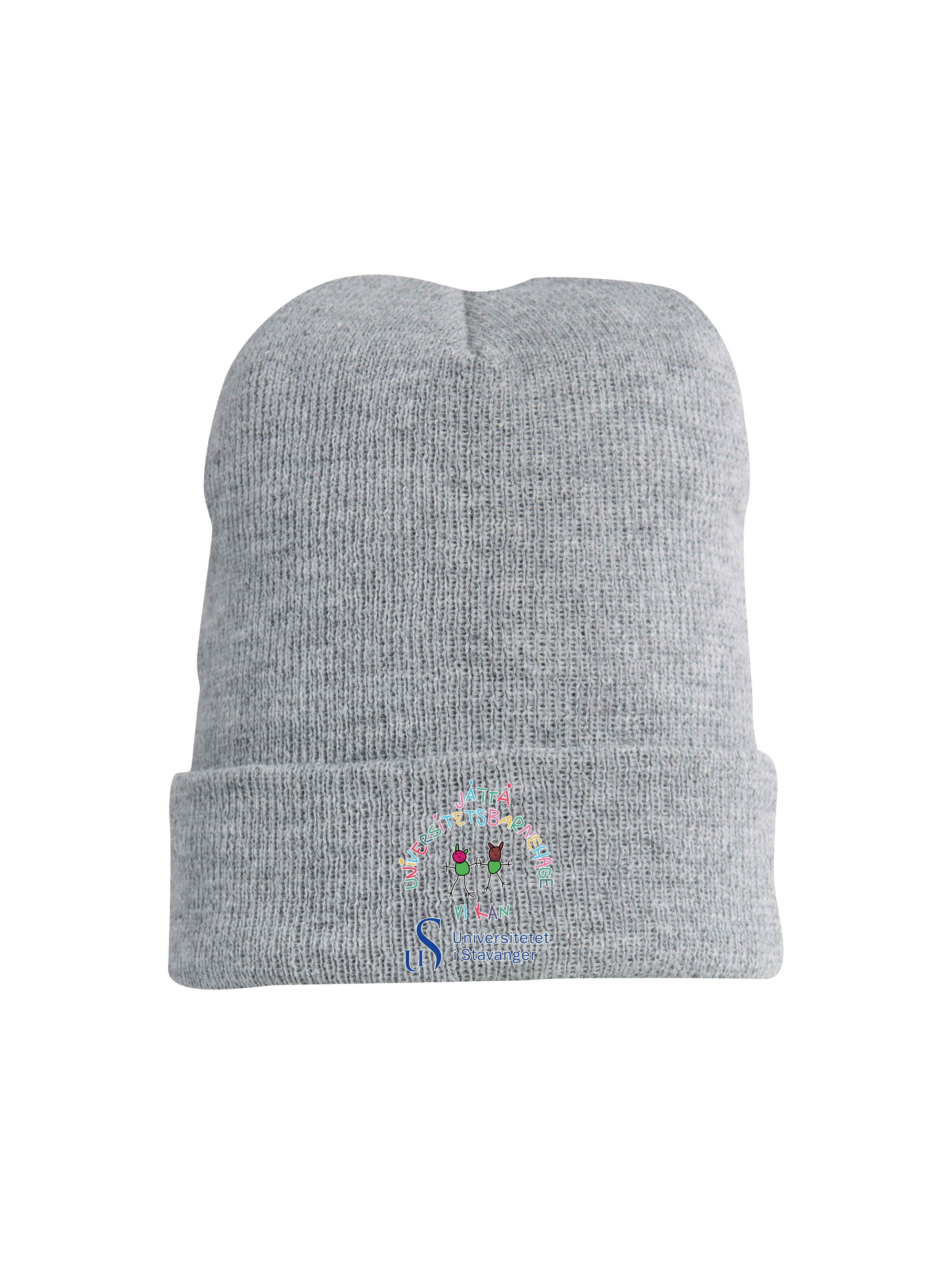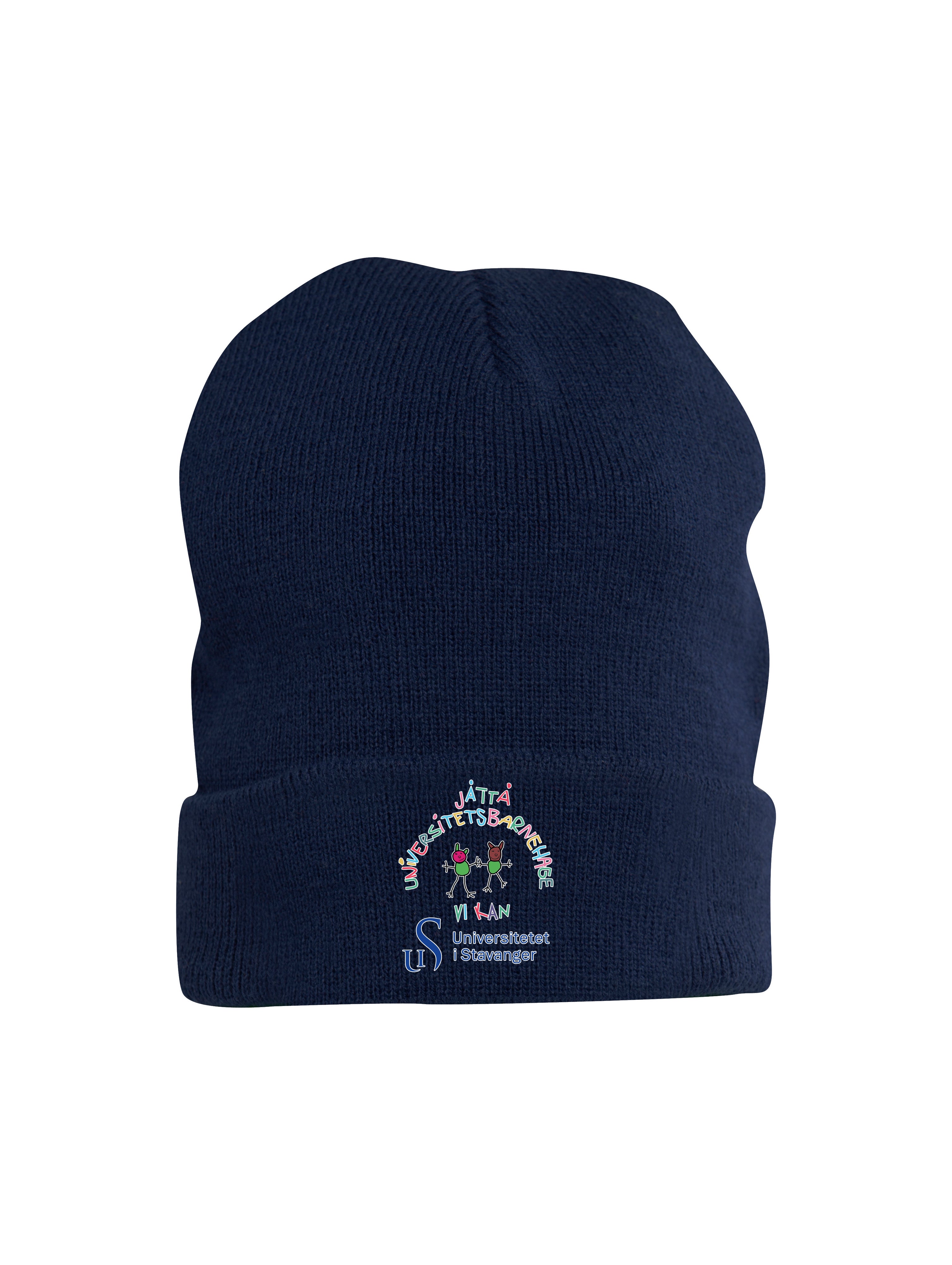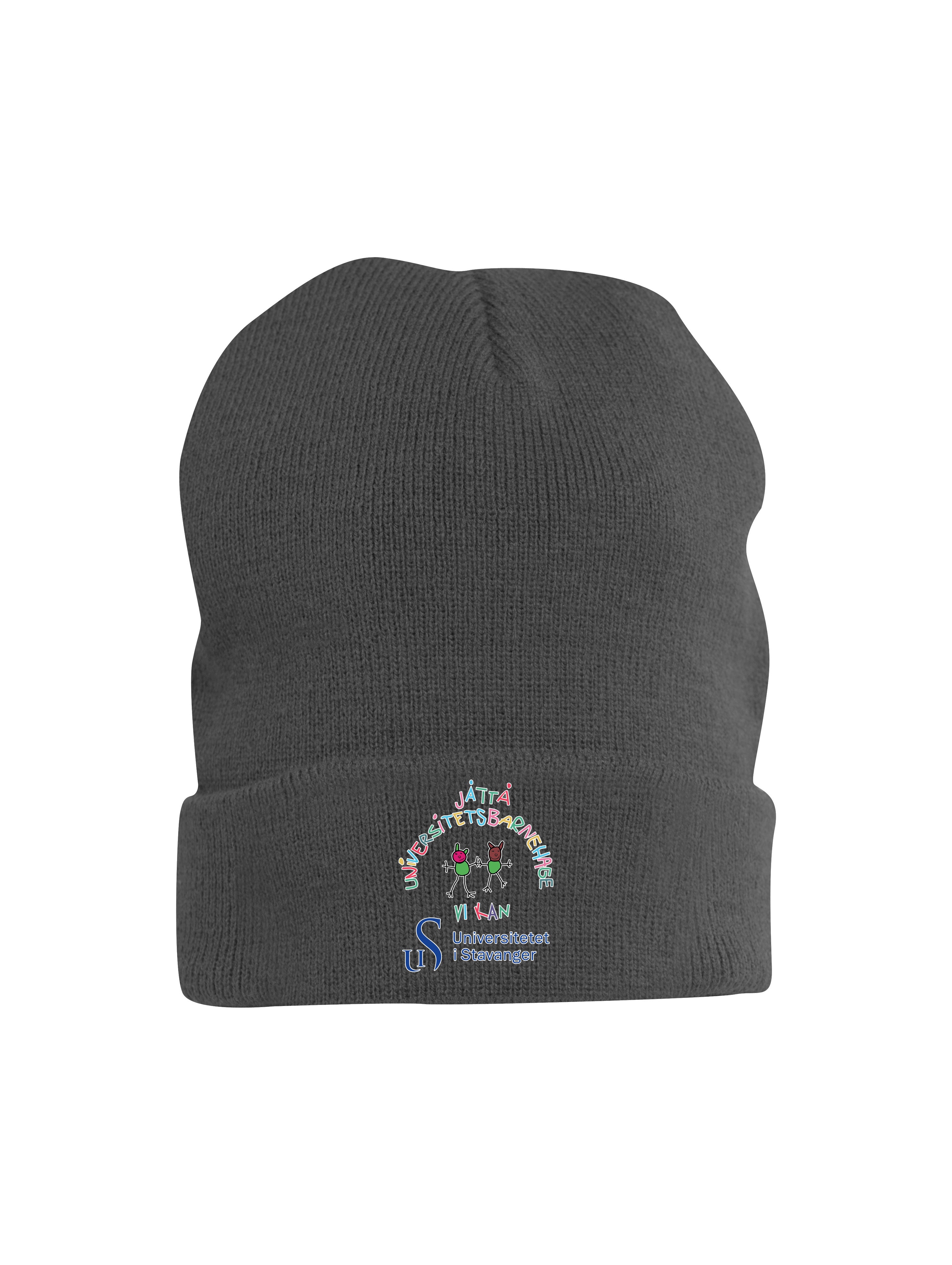 Varm strikket lue med oppbrett, med felt til å trykke på.