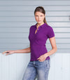 Piké til dame med to jaquardstriper på kragen. Knappestolpe med 3 knapper går ton-i-ton og splitt i sidene....